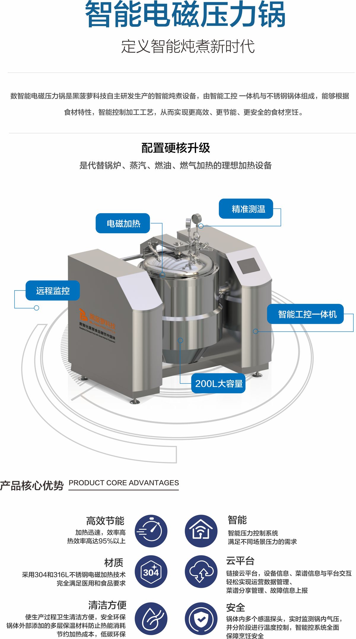 智能电磁压力锅采用最新的304不锈钢电磁加热技术,集智能控温、智能控压、智能云配方、智能配料等功能于一体。适用于大型中央厨房、机关及企业食堂炖蒸煮、炖汤、熬粥、烧菜等多种加工需求。