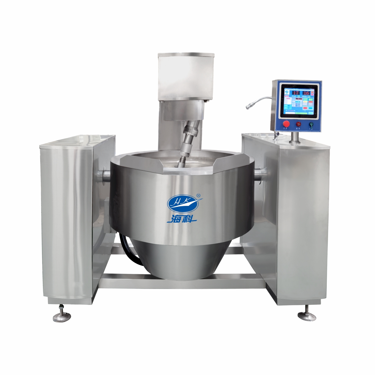电磁摇锅采⽤电磁加热原理,具有微电脑控温技术、智能补温技术,采⽤⾏星式刮底搅拌,不粘锅⽆搅拌死⻆,操作简便轻触按钮即可实现锅体翻转及搅拌。本机可⾃动精确控制温度、搅拌速度及加热时间,可解决在加热过程中各⼯艺参数依靠操作者经验来控制产品质量的问题,避免在加⼯过程中⼈为因素对产品质量产⽣的影响,提⾼⼯艺可控性,保证产品质量。